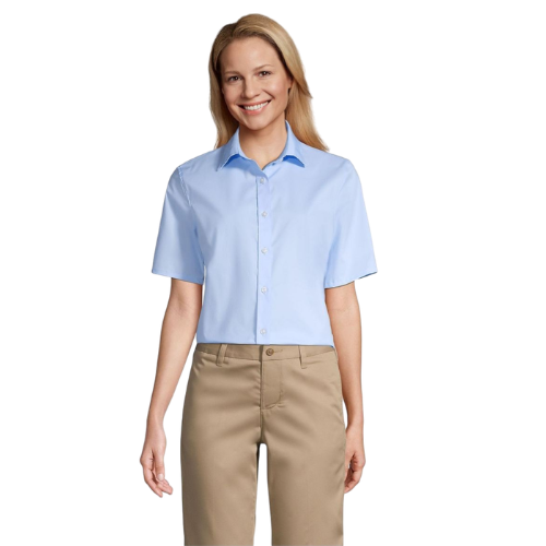 La blusa oxford manga corta celeste para mujer es una opción elegante y fresca para entornos laborales.